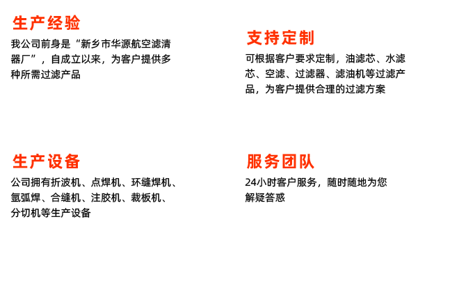 新乡市华航滤清器有限公司,自成立以来,公司专注滤芯、过滤器、滤油机的研发、生产、销售,利用自身研发技术,为客户打造各种配套产品。公司拥有各类波纹机、注胶机、滚焊机、滚纸机、氩弧焊机、直缝焊机、自动焊机、剪板机等加工设备,让各种产品在生产中可有序进行目前我公司主要生产的产品有油滤芯、水滤芯、空气滤......更多>>